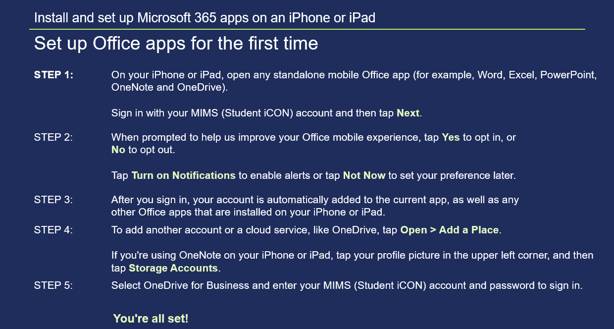 Instructions for set up of Microsoft 365